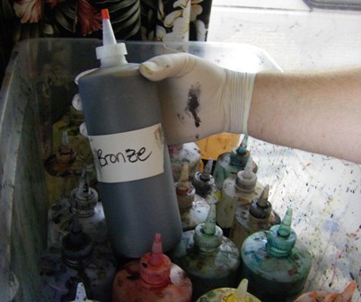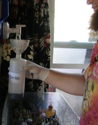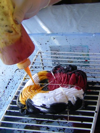 ![]() Check out http://www.MadeByHippiesTieDyes.com to view our newest tie dye shop. ![]() How To Tie Dye How To Tie Dye: Overview There are four steps to the tie dye process. Tieing Dipping Dying Washing Out How To Tie Dye: Tieing Instructions 1) Put 100% cotton t-shirt in the washing machine and wash regularly. 2) Lay wet t-shirt flat on a table. ![]() 3) Grasp the middle of the t-shirt and twist into a spiral. ![]() ![]() ![]() 4) Tie with three pices of artifical sinew or rubber bands. ![]() ![]() How To Tie Dye: Dipping Instructions 5) Dip t-shirt into a bucket of water that has half a cup of soda ash solution mixed in for every gallon of water. 6) Set shirt on a shelf to dry for a few days before it is dyed. How To Tie Dye: Dying Instructions 7) Mix up some differant colors of Procion Dye with water into squirt bottles. 7A) Take cap off squirt bottle and insert funel. 7B) Add one tablespoon of dye for every 16 oz of water. 7C) Fill bottle with water about half way. 7D) Shake and swirl bottle to mix dye powder into the water. 7E) Finish filling bottle and put cap on. 7F) Shake vigorously to mix dye, when there are no dry dye particles floating dye is ready to be used. 8) Set dry dipped tied t-shirt onto a rack inside a plastic container. 9) Hold t-shirt on it's side and apply Black to the entire bottom of the t-shirt. 10) Apply red to a pie shape wedge that covers one third of the t-shirt. 11) Apply yellow next in the same way. 12) Apply green to the remaining third of the t-shirt. 13) Leave t-shirt to sit for twelve to eighteen hours. How To Tie Dye: Washing Out Instructions 14) Fill washing machine with super hot water and add one half a cup of synthrapol or similar super strength laundry detergent. (Anywhere from one to about fifteen t-shirts can be washed in one load at a time.) 15) Cut the rubber bands off of the t-shirt. 16) Place t-shirt in the washing machine making sure to fully submerge the entire shirt under the water. 17) Once the washing machine has finished, add another half cup of synthrapol and run the washing machine for a second time. 18) Place the tie dye t-shirt in the dryer and dry. 19) Take the tie dye t-shirt out of the dryer and put it on. 20) Take a picture of yourself and e-mail it to us! Enjoy your tie dye t-shirt! We built a whole website just to teach the masses how to tie dye. Please check out www.HowToTieDye.net to Learn How To Tie Dye! Made By Hippies Tie Dye Kit ![]() Learn to tie dye just like the hippies! Visit Made By Hippies's profile on Pinterest. Made By Hippies is a retailer & wholesaler of handmade tie dye clothing, chainmaille, glass & hemp jewelry, glass and polymer clay functional art & handmade soaps and beauty products. All Made By Hippies products are handmade by Amanda & Erik in their Sandy, Oregon home using renewable energy. Made By Hippies Tie Dyes are 100% cotton, colorfast and preshrunk. For a looser fit order one size larger. Tie dyes are safe to wash and dry with your regular laundry. We wash all our tie dyes three times with hot water and super strength detergent during the Tie Dye process so you can wash them with your other clothes and they won't bleed dye - Guaranteed!! Free Shipping ![]() Thanks for visiting www.MadeByHippies.com |